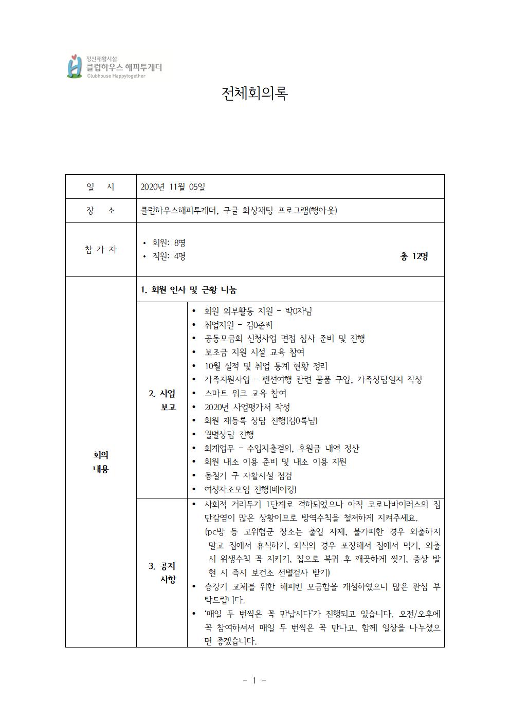 부득이하게 전체회의에 참여하지 못하신 분들은 전체회의록을 참고해 주시면 좋을 것 같습니다 :)