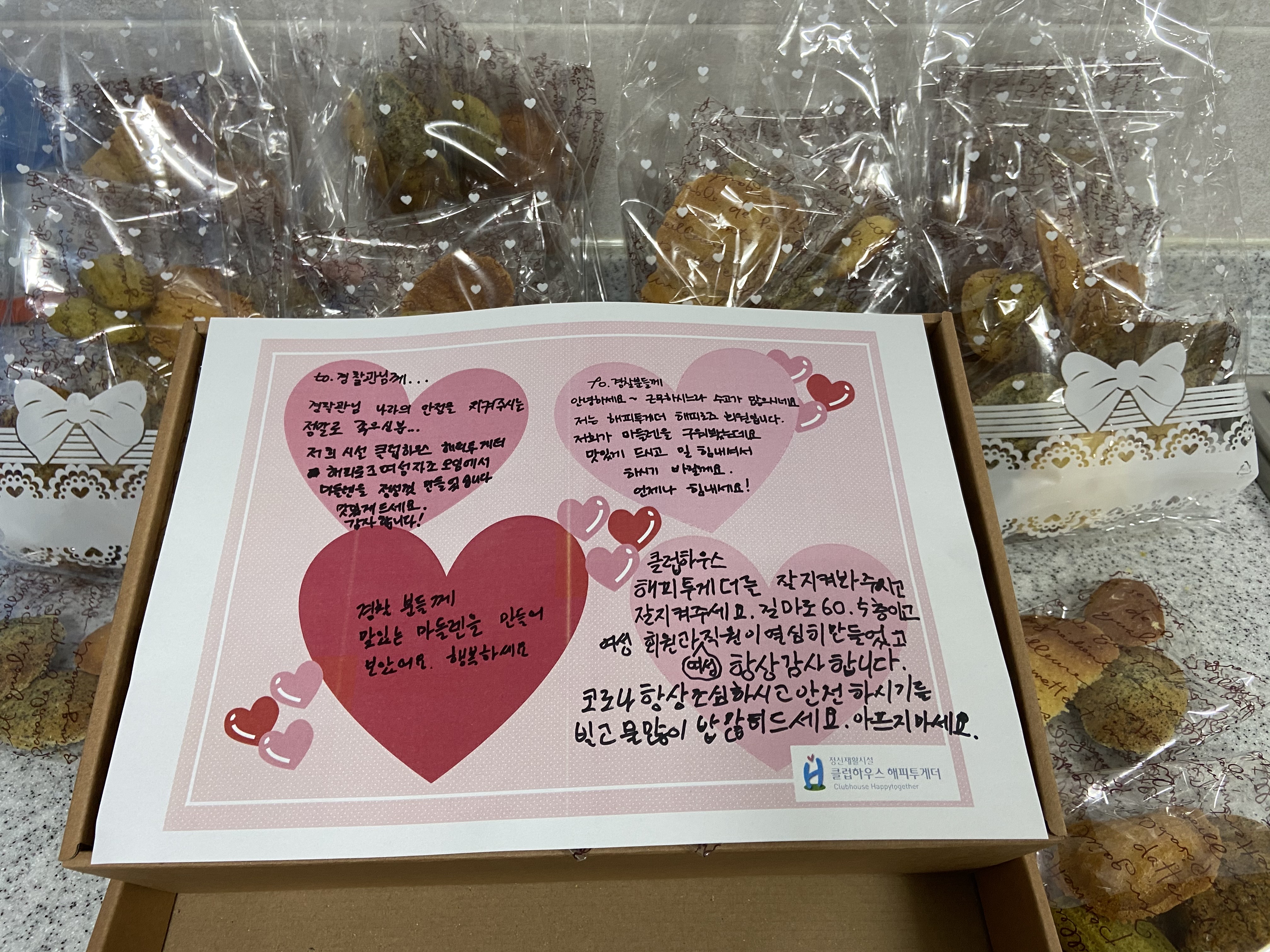 처음엔 당황하시던 경찰관도 이야기를 듣고 잘 먹겠다고 하며 클럽하우스 해피투게더에 대한 이런 저런 질문도 하셨습니다.