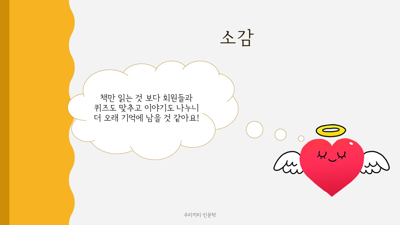 그것은 '책만 읽는 것 보다 회원들과 퀴즈를 맞추고 이야기를 나누니 더 오래 기억에 남을 것 같다.'는 것이었습니다.