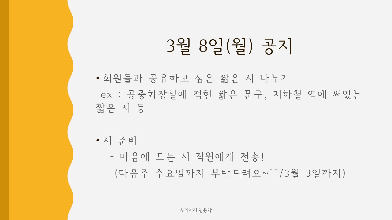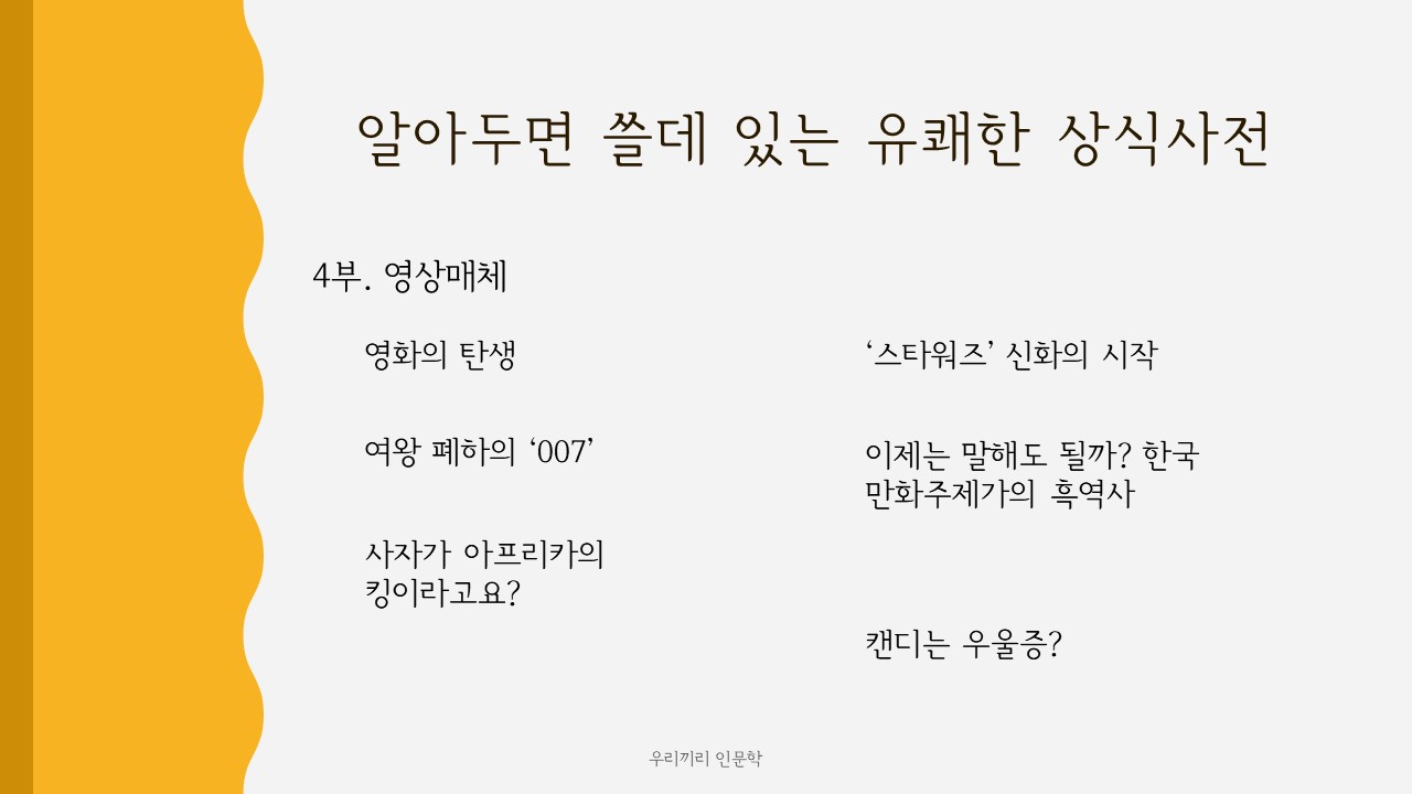 *다음 온라인 프로그램 '우리끼리 인문학'은 3월 8일 월요일 오후 2시에 진행됩니다.*