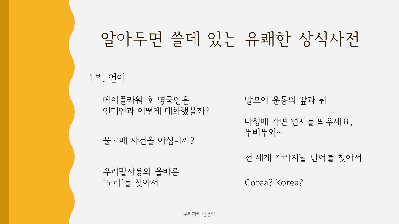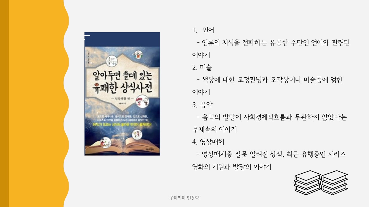 언어, 미술, 음악, 영상매체에 관련된 우리가 잘못알고 있던 사실에 대해 바로 잡아주는 내용이죠~^^
