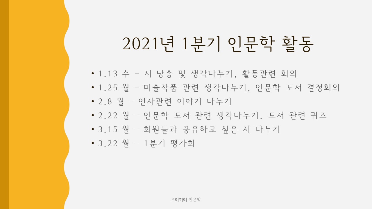 자기가 좋아하는 미술작품 공유하기, 화장실 문구같은 일상에서 흔히 볼수 있는 아름다운 글귀나누기, 책한권을 선정하여 그 책에서 좋아하는 글귀를 퀴즈로 표현하기, 일상생활에서 힘이 되는 글귀나누기 등등 진행한 것 같은데, 재미있고, 유쾌하게 참여했던 기억이 있다.