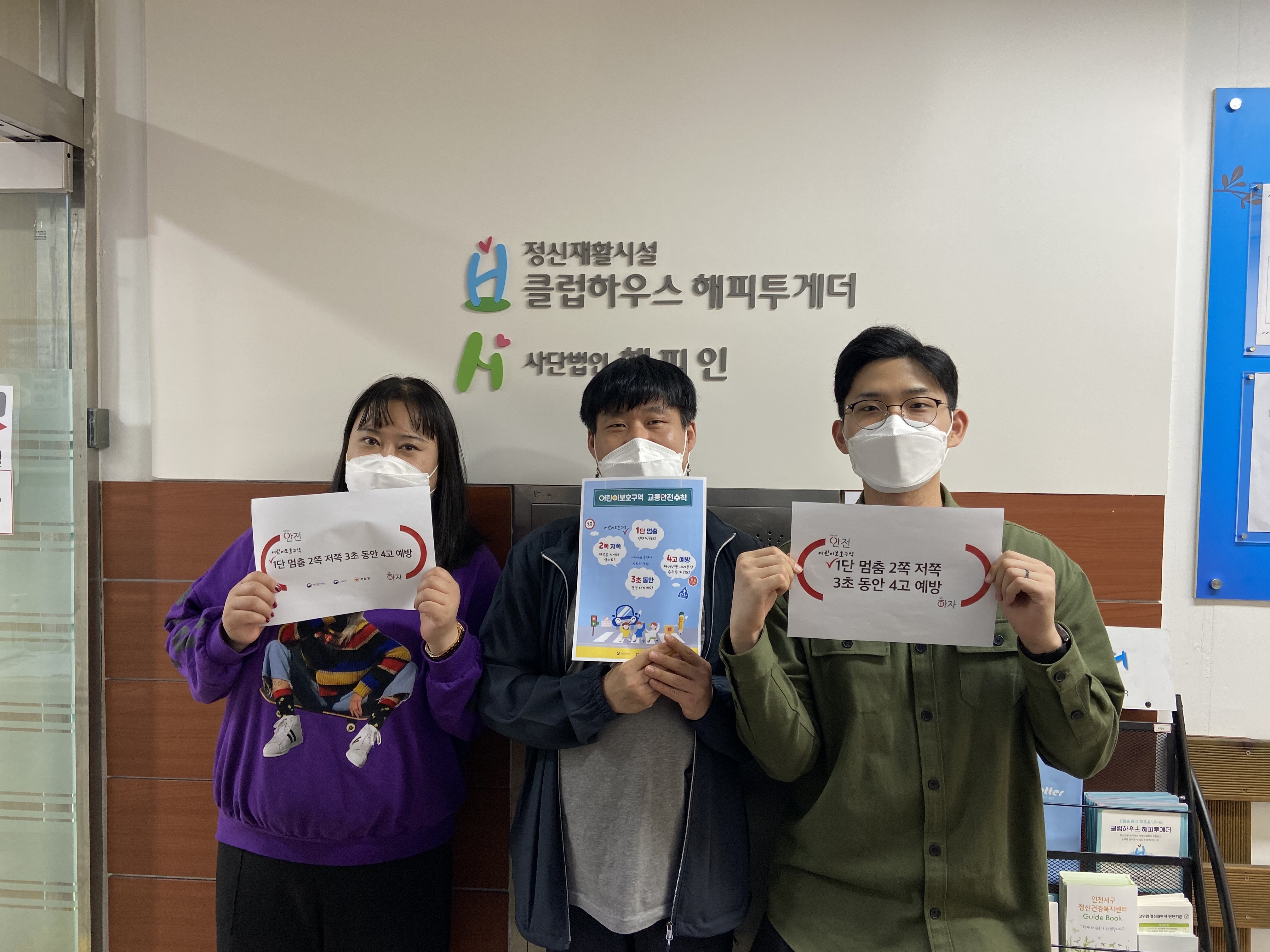 남동정신재활시설 그루터기의 지목으로 '어린이 교통안전 릴레이 챌린지'에 참여했습니다. 변 윤(직원), 김려원씨, 박종위씨(회원)가 클럽하우스 해피투게더의 대표로 챌린지에 참여했으며 어린이 보호 문화, 교통사고 예방에 대한 경각심을 갖는 기회가 되었습니다.