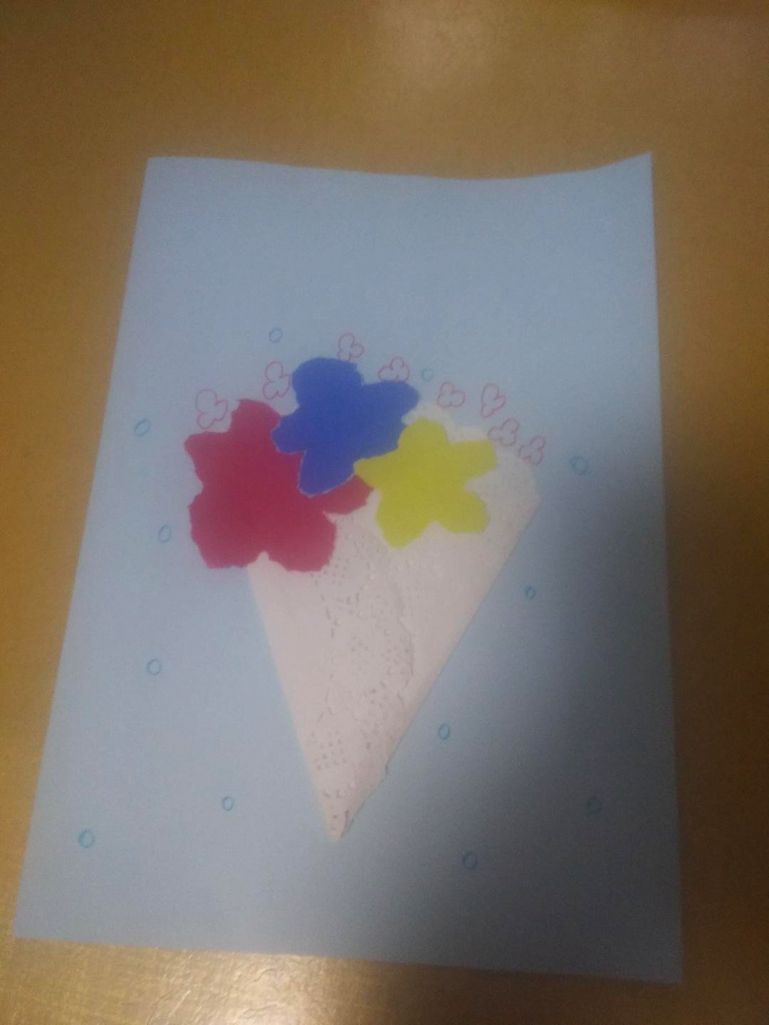레이스로 삼각현 꼬깔콘처럼 접은 다음에 세 가지 색깔로 꽃 모양을 접어서
