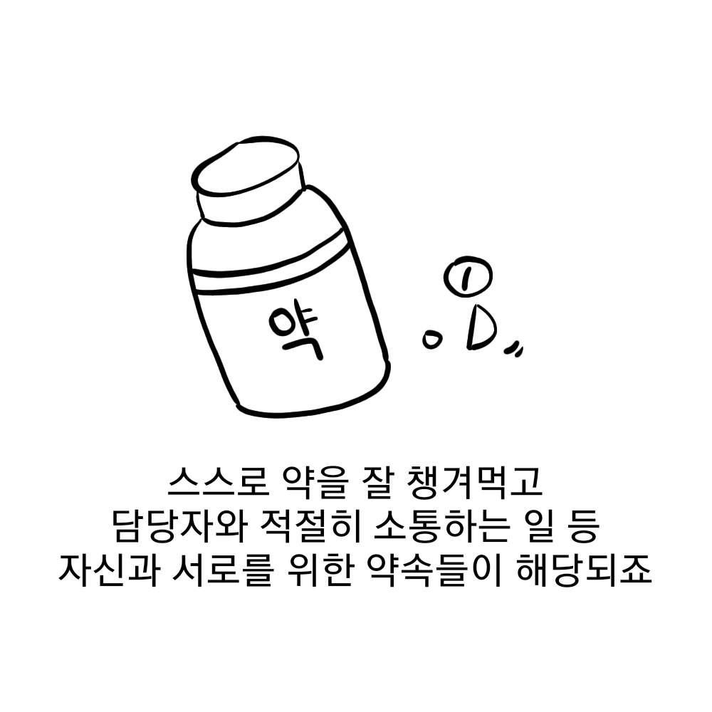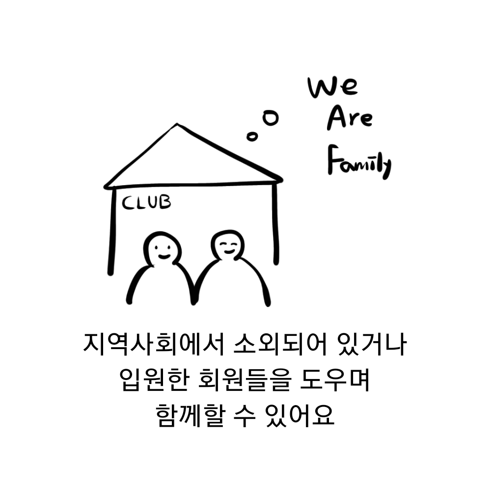 스스로 약을 잘 챙겨먹고 담당자와 적절히 소통하는 일 등 자신과 서로를 위한 약속들이 해당하죠. 많이 어렵지는 않아요! 공동체 생활이라는 것만 기억하면 됩니다. 상호간의 이해와 배려만 있다면 우리는 언제든 클럽하우스를 이용하고 지역사회에서 소외되어 있거나 입원한 회원들을 도우며 함께할 수 있어요.