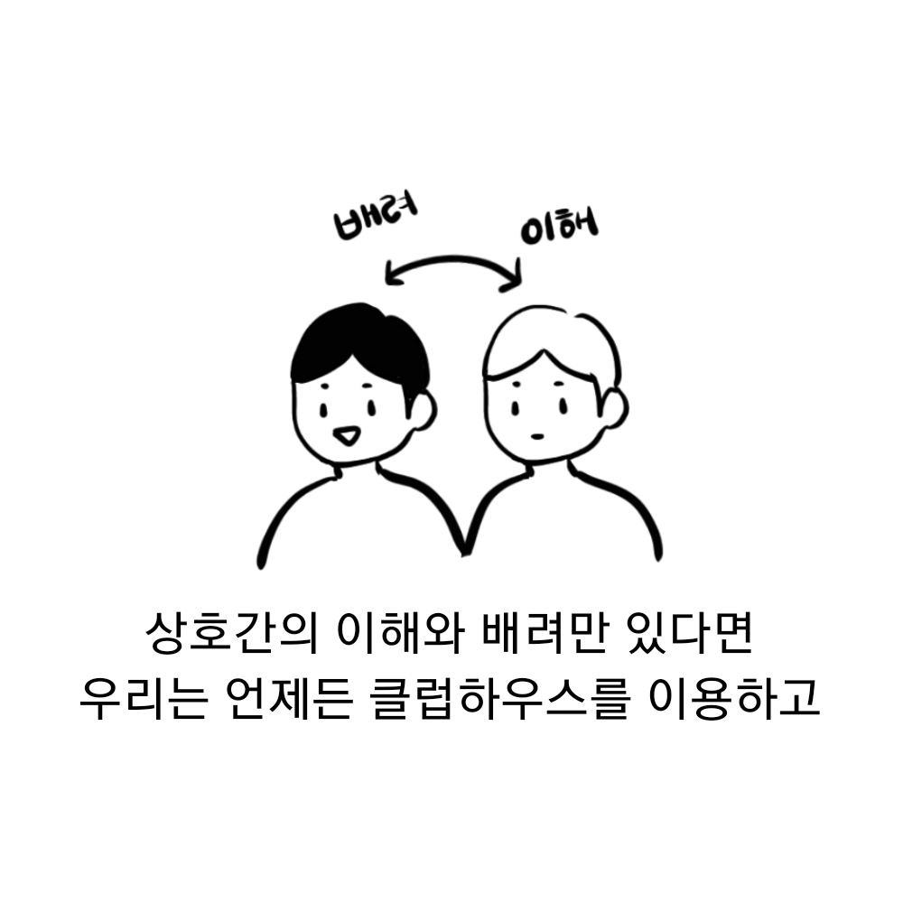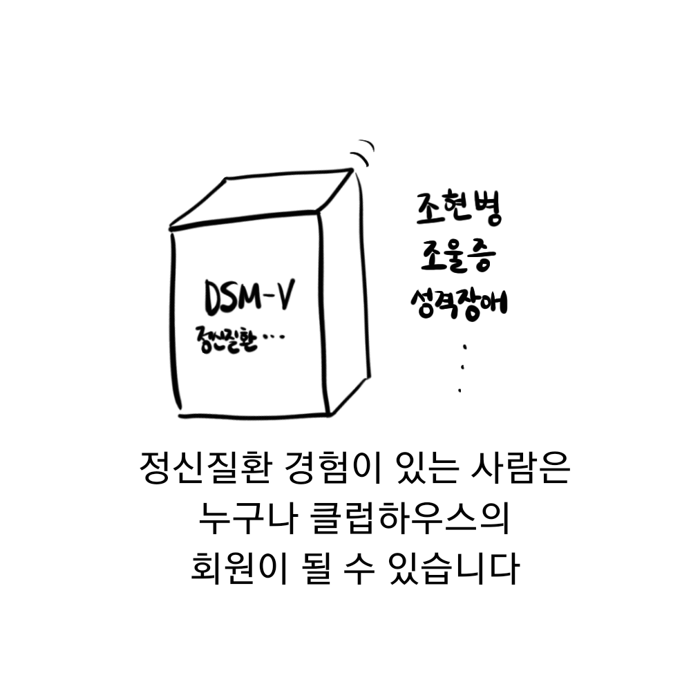 스스로 약을 잘 챙겨먹고 담당자와 적절히 소통하는 일 등 자신과 서로를 위한 약속들이 해당하죠. 많이 어렵지는 않아요! 공동체 생활이라는 것만 기억하면 됩니다. 상호간의 이해와 배려만 있다면 우리는 언제든 클럽하우스를 이용하고 지역사회에서 소외되어 있거나 입원한 회원들을 도우며 함께할 수 있어요.