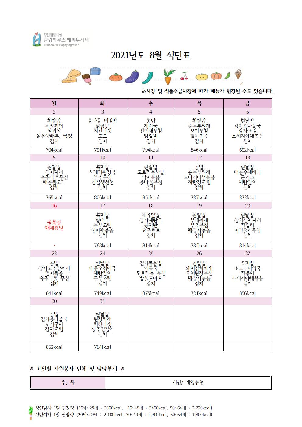 8월 식단표 게시합니다.