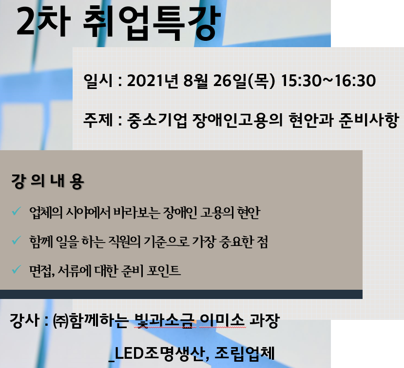 8/26(목) 15:30에 진행 될 예정입니다. 주제는 “장애인 고용의 현황과 준비사항”이며