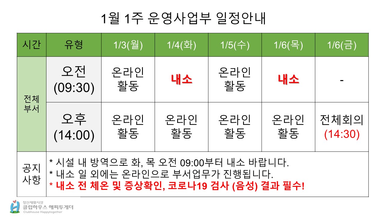 클럽하우스해피투게더 2022년 1월 1주 부서별 내소, 활동일정 안내드립니다.