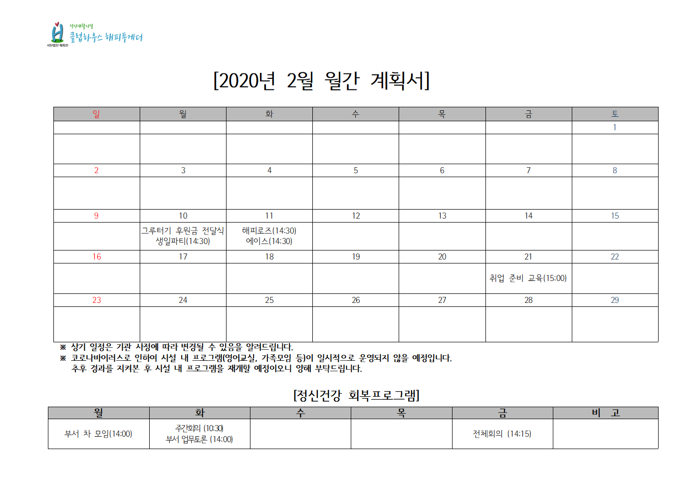 2020년 2월 월간계획