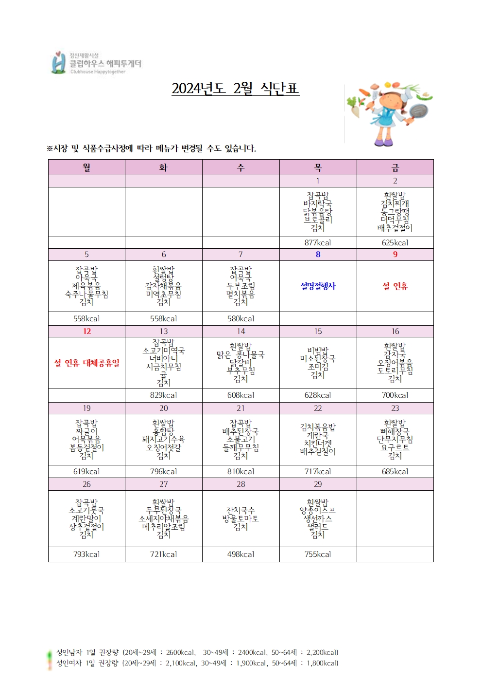 2024년 2월 식단표