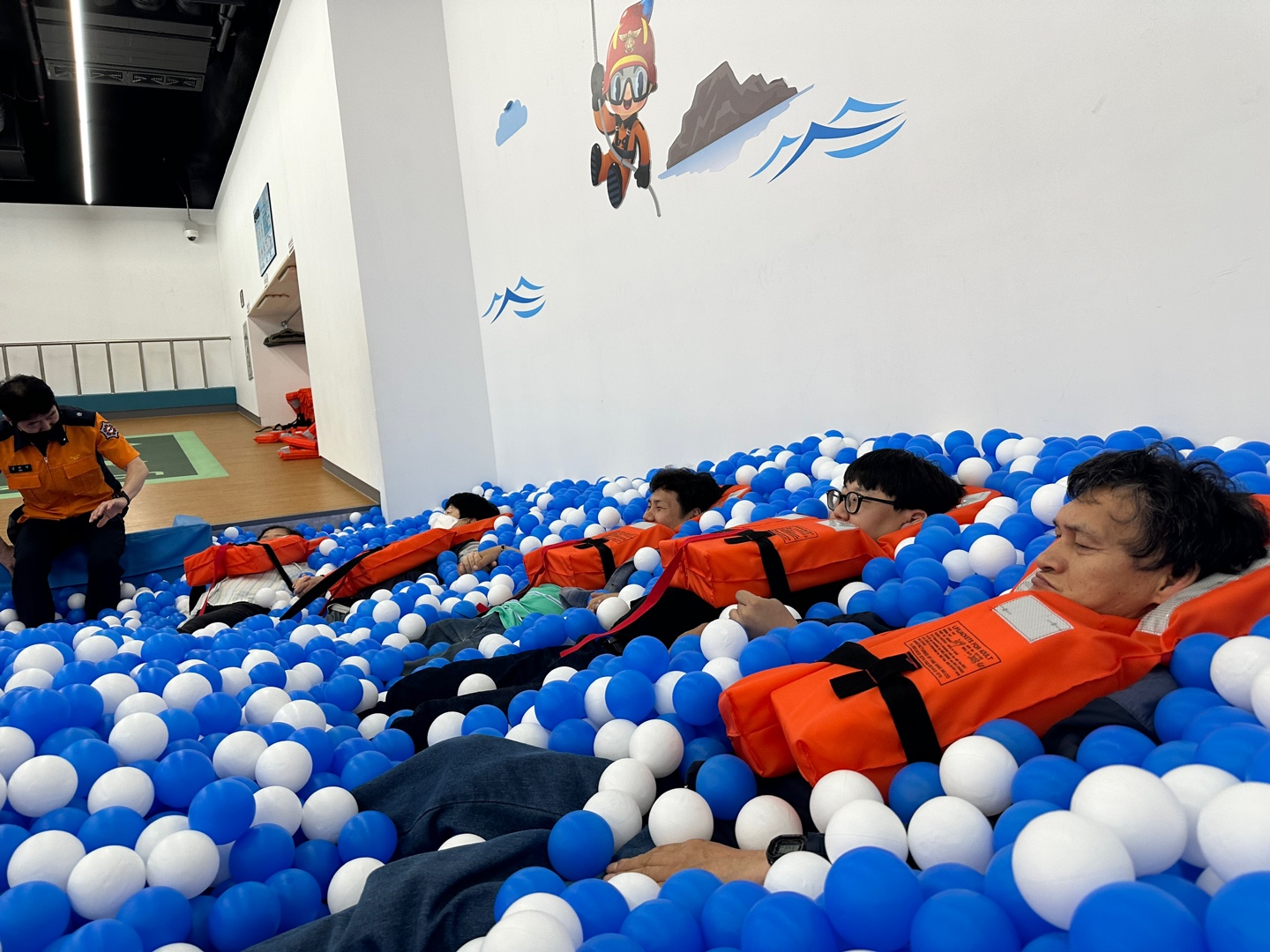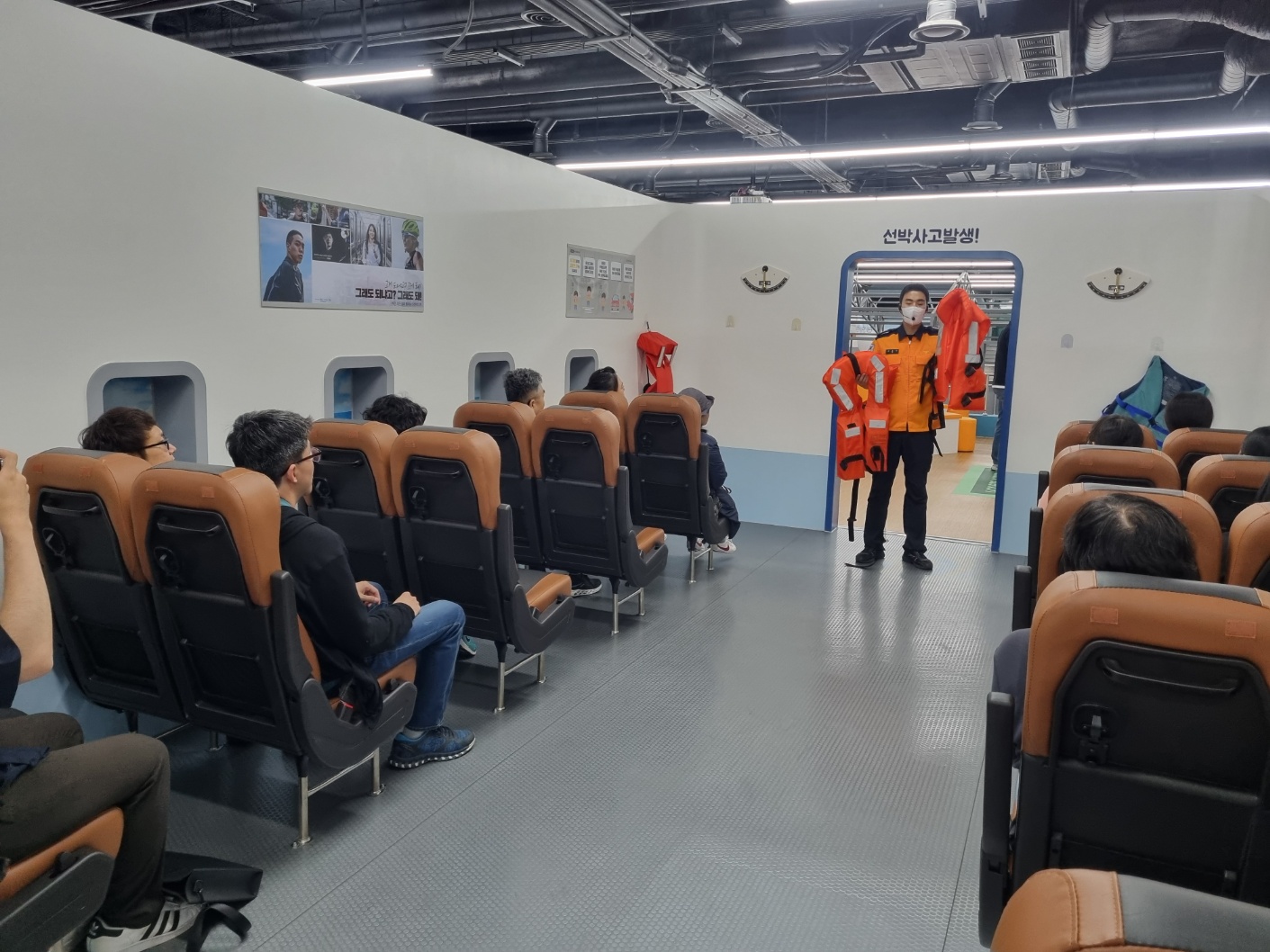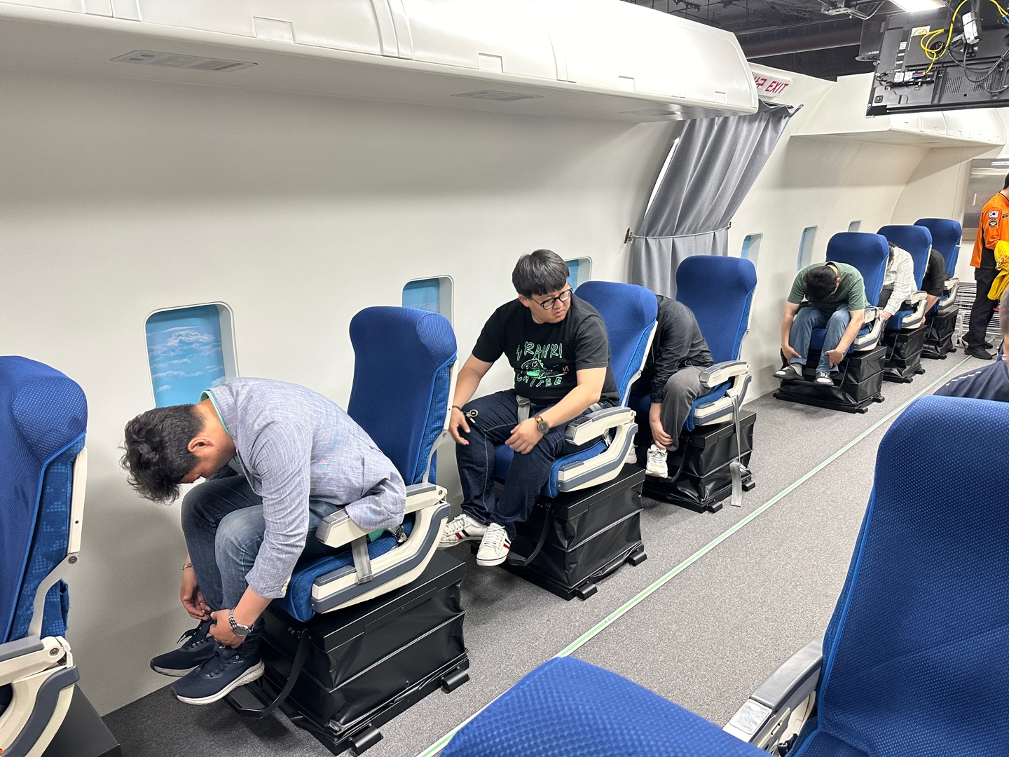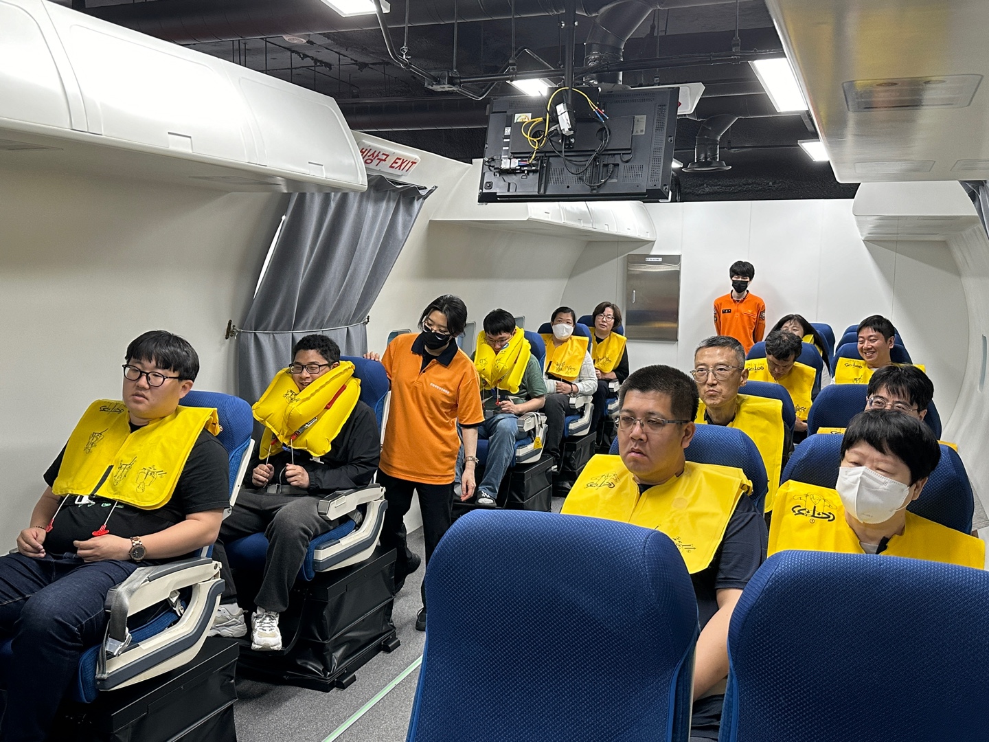 항공안전 교육은 4D 영상을 통한 시청각 교육, 안전벨트와 구명조끼 착용법, 충격방지 자세에 대해 교육을 들었고, 이후 실제로 대피하는 훈련도 진행했습니다.