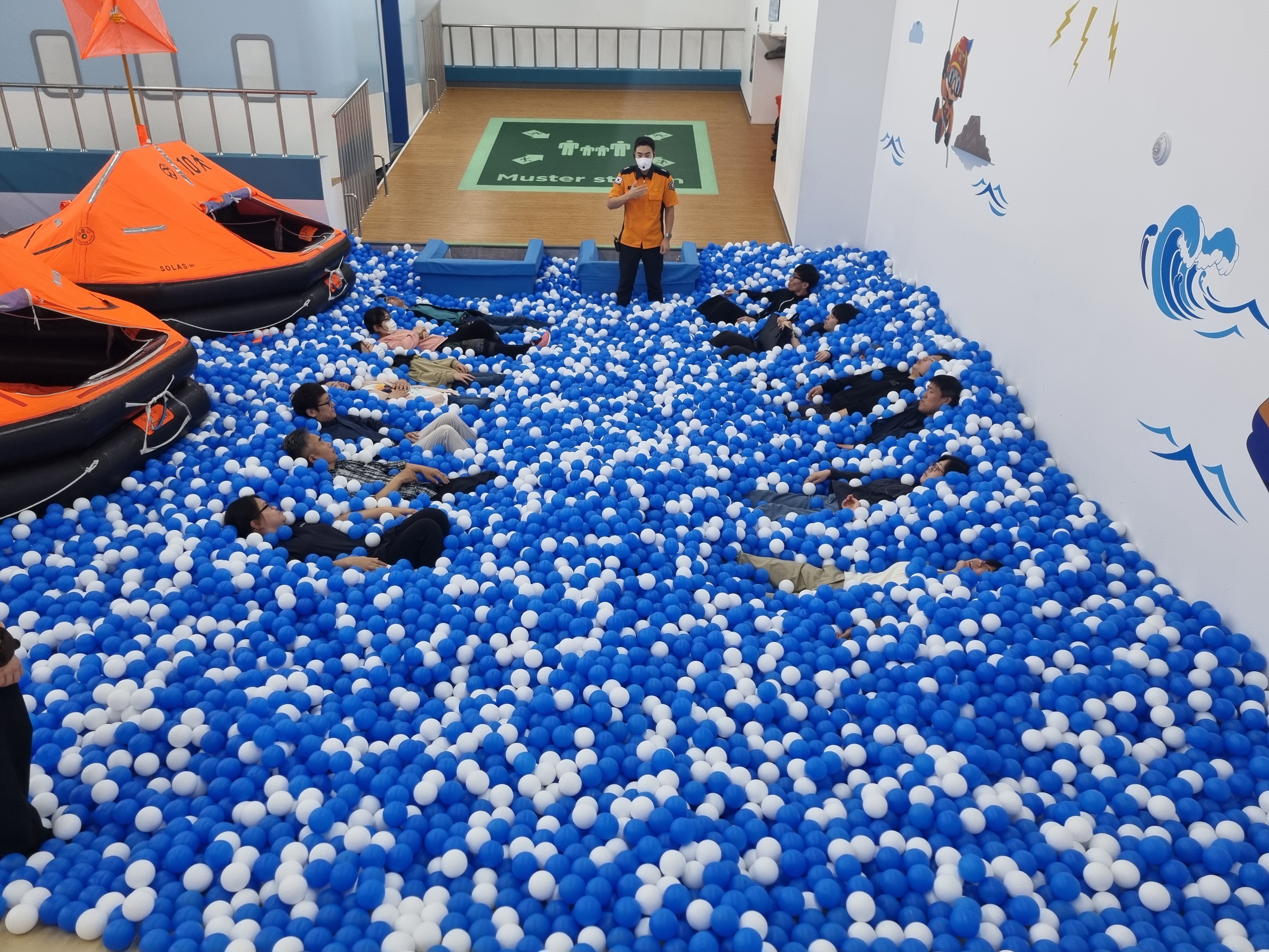 해양안전 교육은 구명조끼의 종류와 착용법, 비상집합장소 안내, 대피자세, 체온 유지자세에 대해 교육을 들었고, 구명뗏목 부장품은 무엇이 있고 어떤 상황에 사용하는지도 배우는 시간을 가졌습니다.