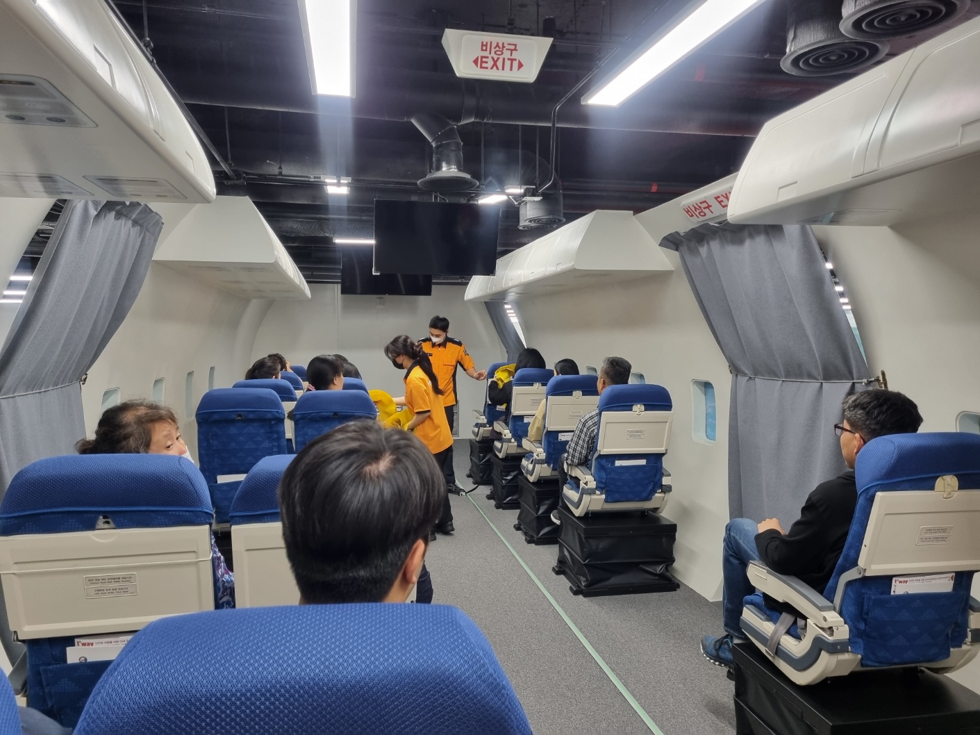 항공안전 교육은 4D 영상을 통한 시청각 교육, 안전벨트와 구명조끼 착용법, 충격방지 자세에 대해 교육을 들었고, 이후 실제로 대피하는 훈련도 진행했습니다.