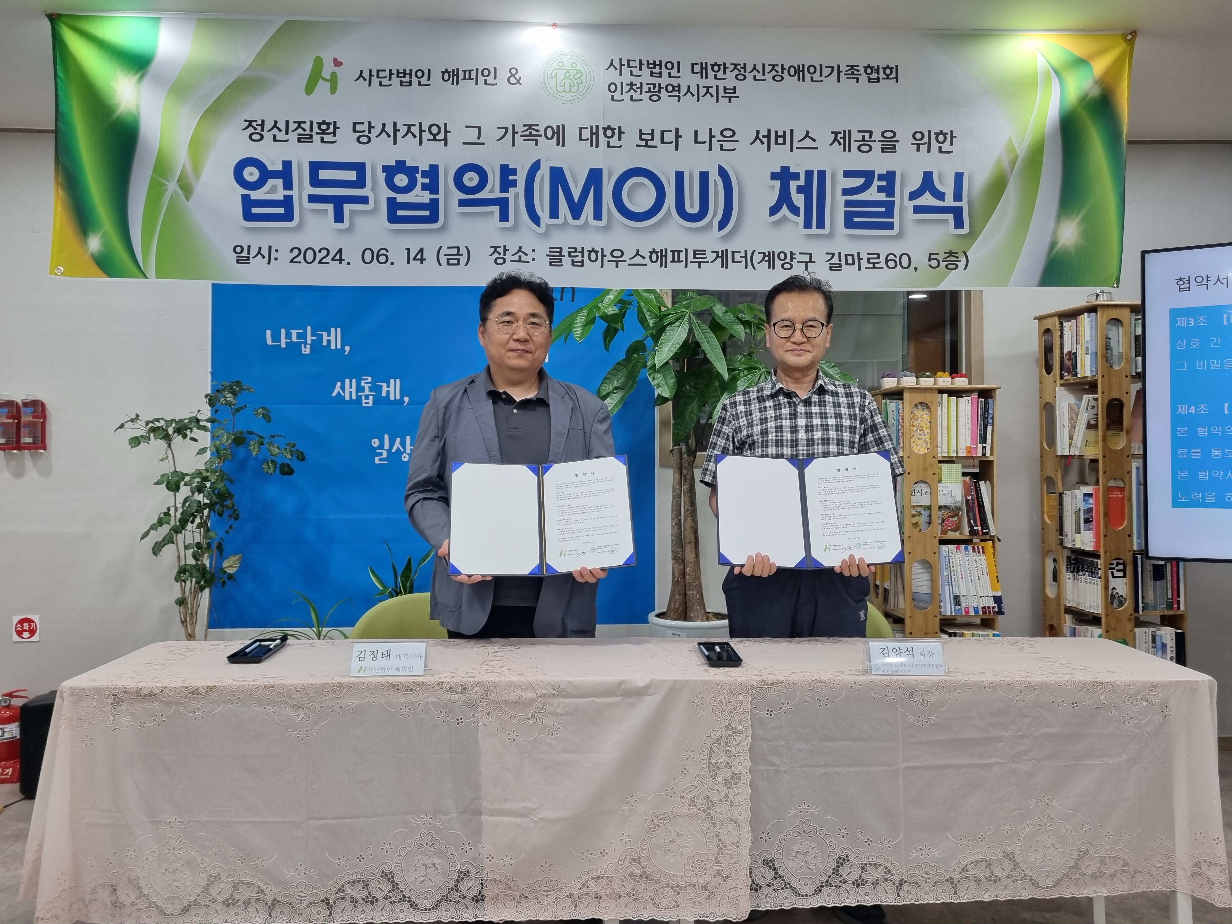 2024년 6월 14일(금), 사단법인 해피인과 대한정신장애인 가족협회 인천지부는 지역 정신건강 서비스의 협업을 위해 협약식을 진행했습니다.