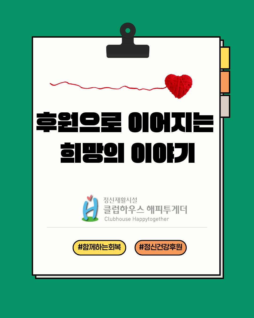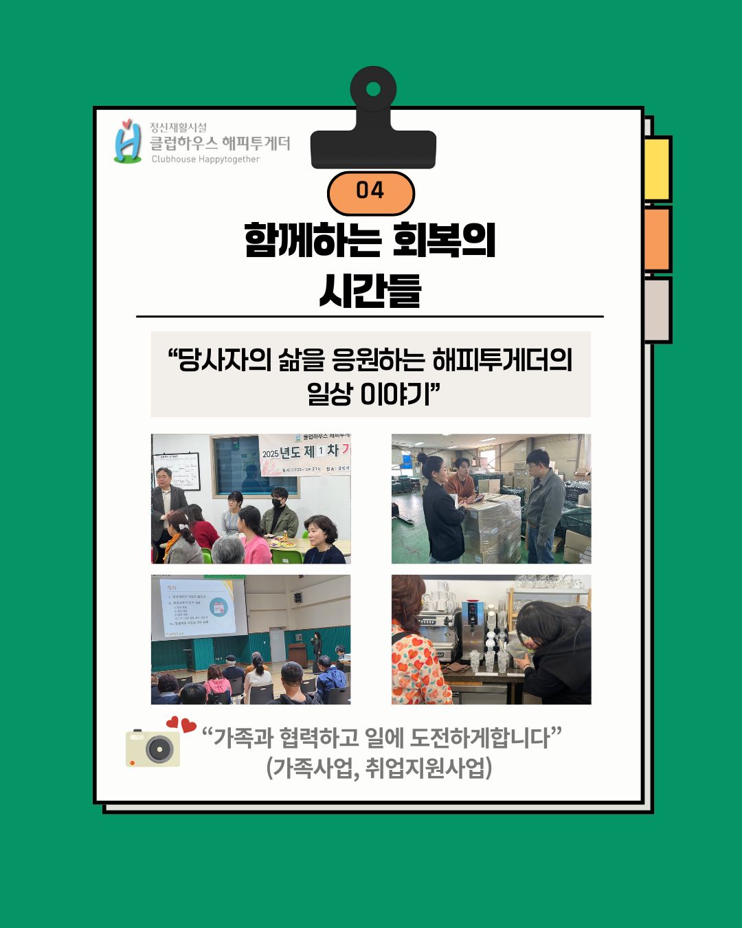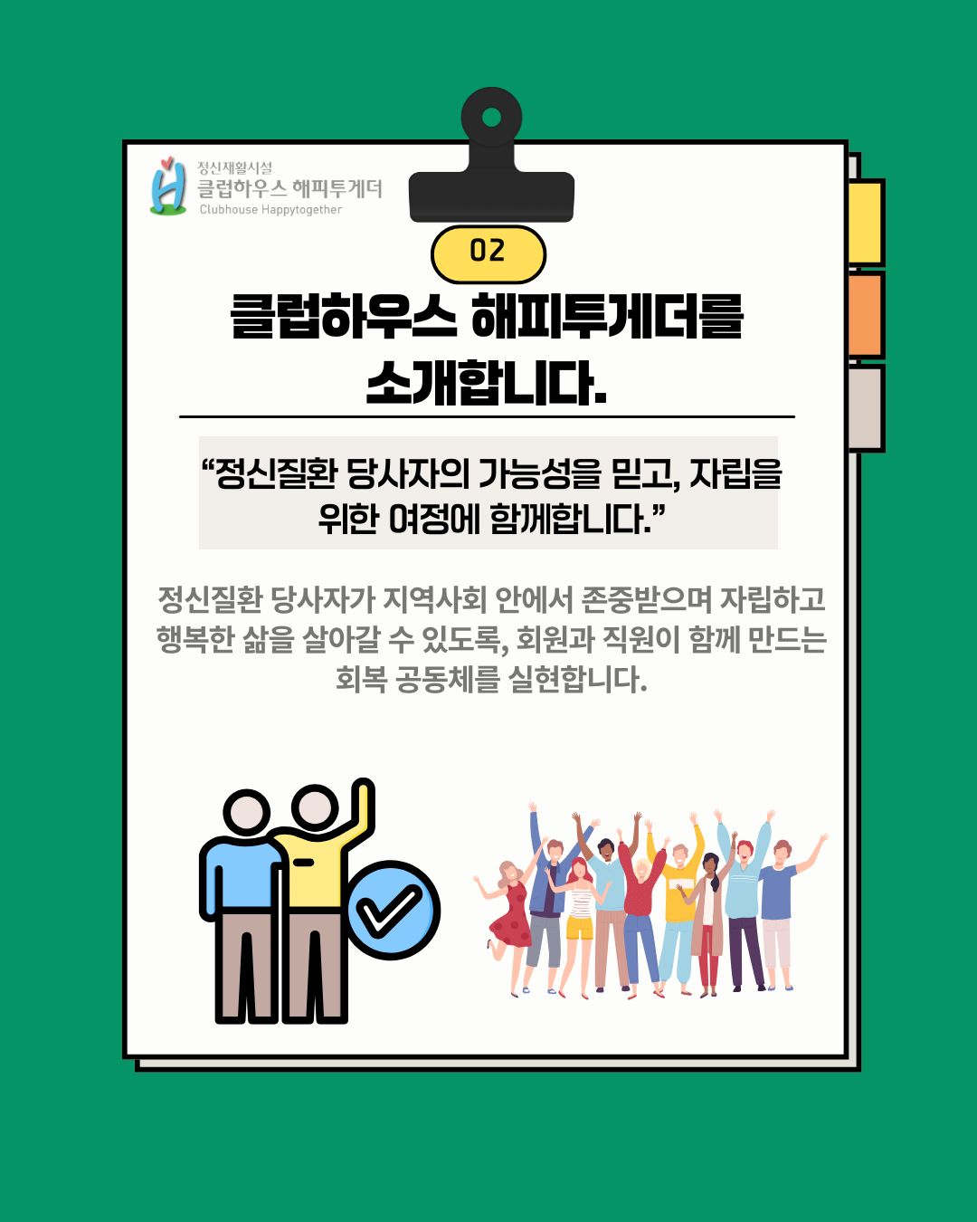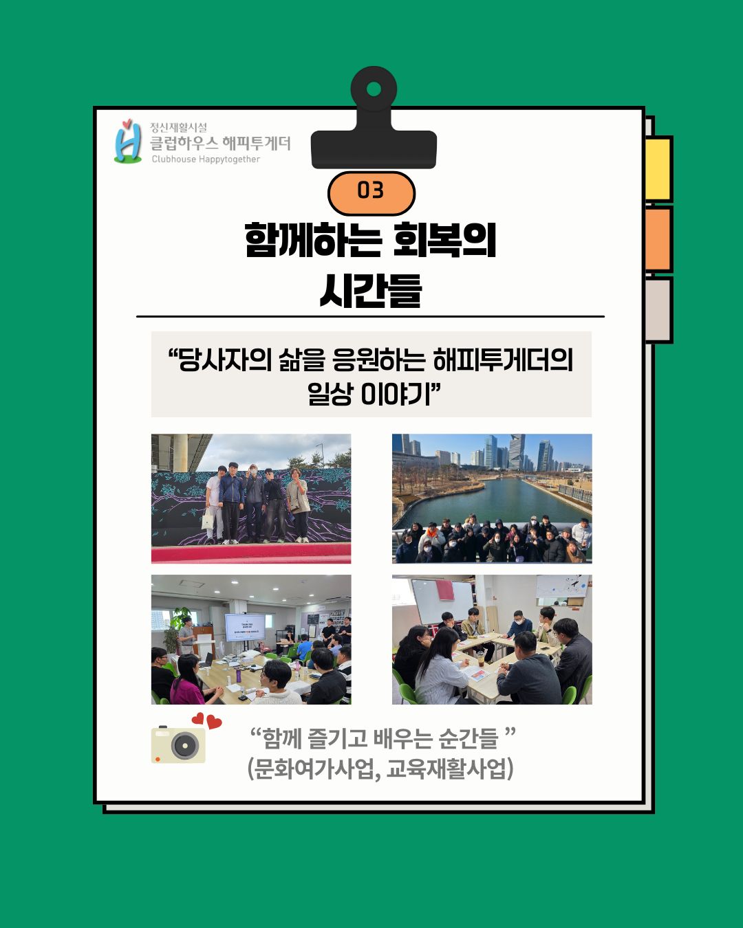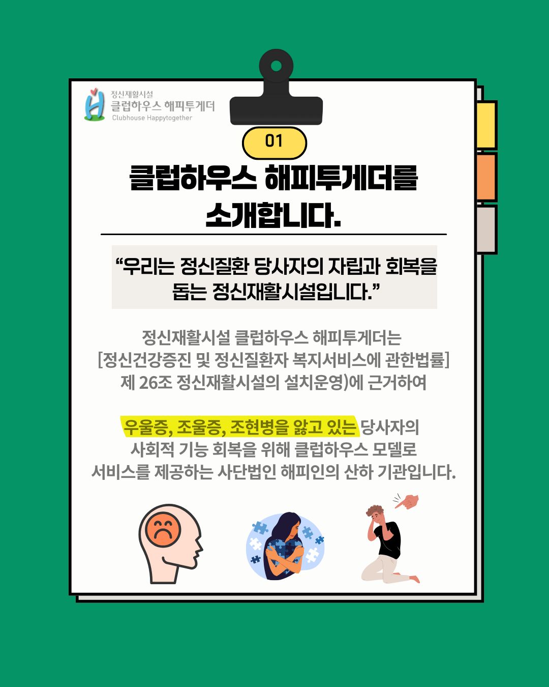 정신재활시설 해피투게더는 정신질환 당사자의 자립과 회복을 돕는 지역사회 기반의 정신재활시설입니다.