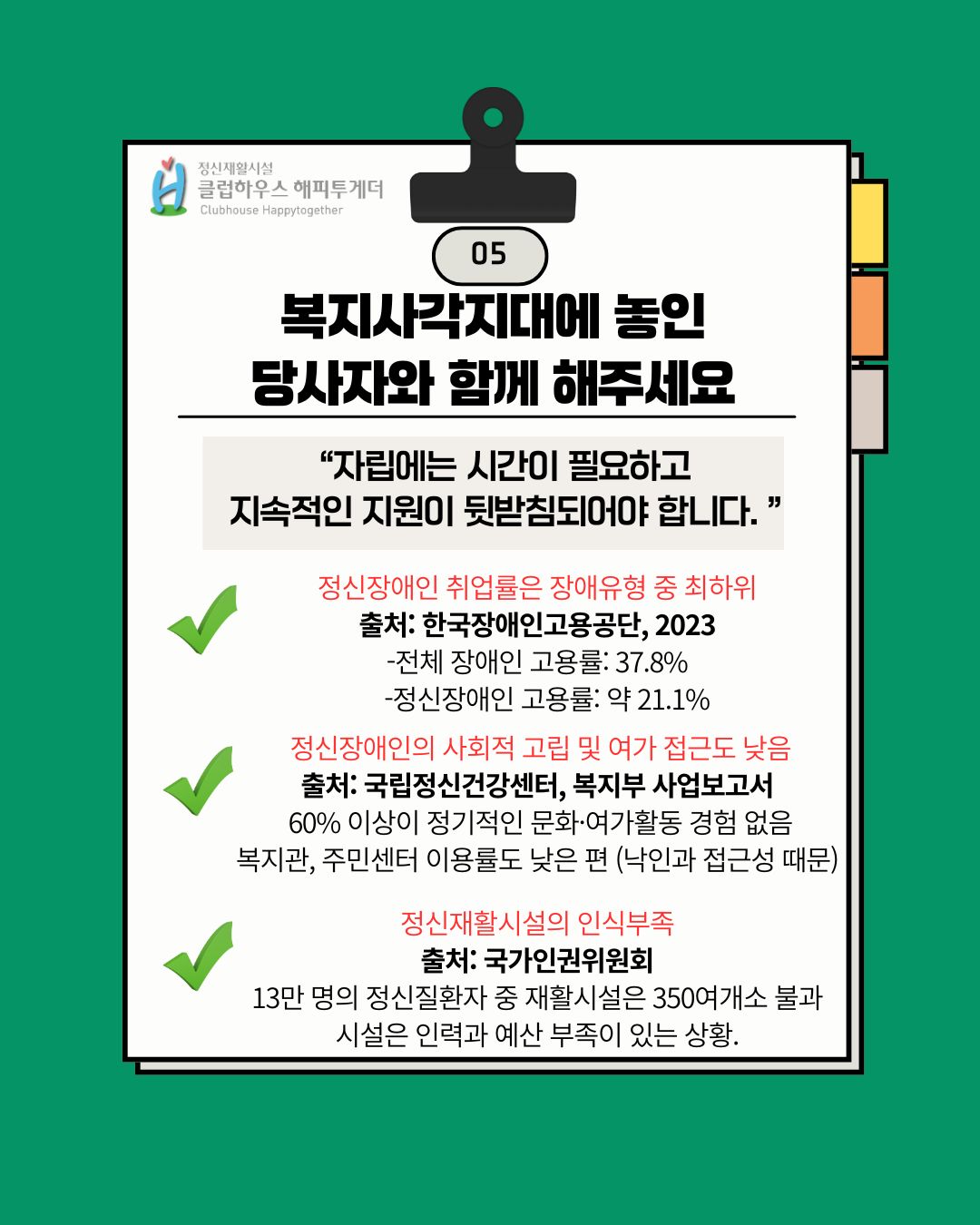 정신질환자의 취업률은 장애유형 중 최하위이며, 재활시설은 13만 명 중 10%도 이용하지 못하는 현실입니다.
