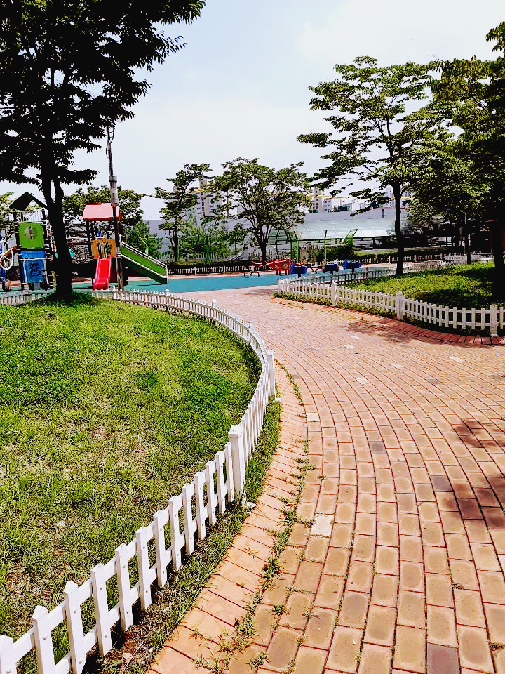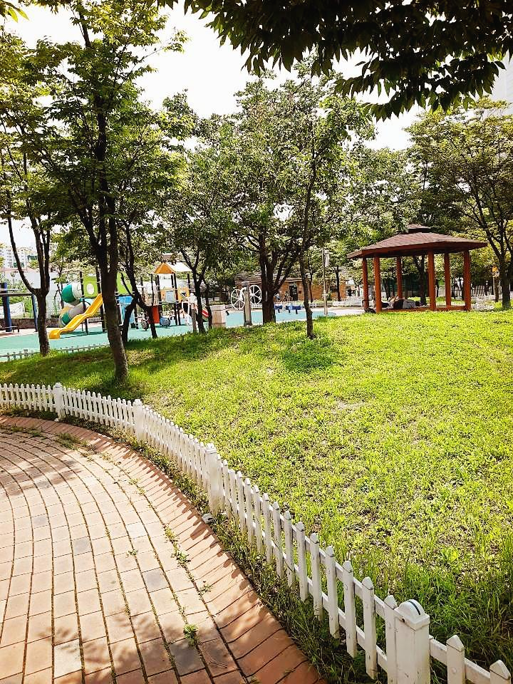 지저귀는새소리와 정자에서 이야기하시는 할머니들 놀러나온 아이들,