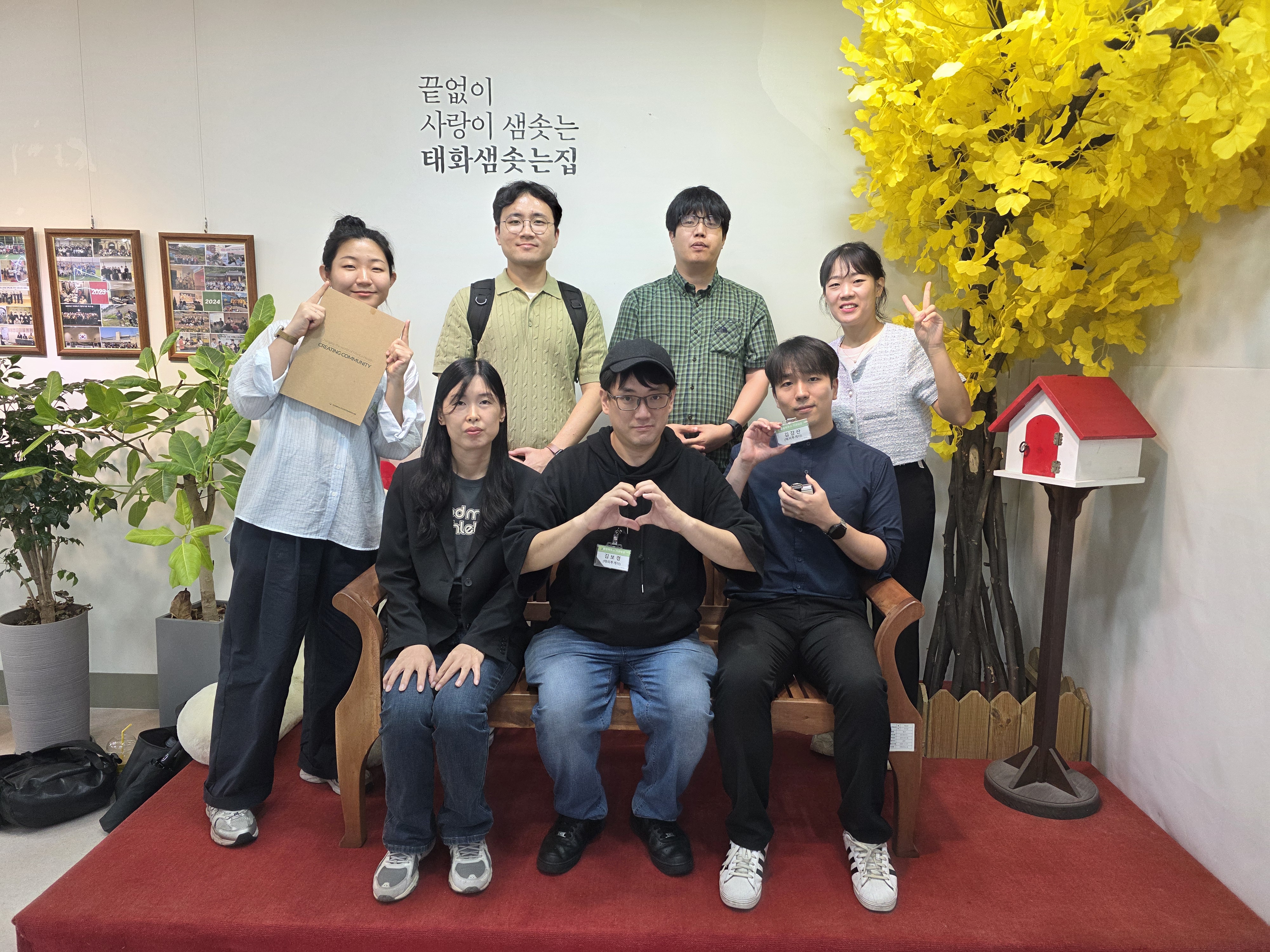 방문을 마치며 우리는 샘솟는집의 포토존에서 단체사진을 남겼습니다. 따뜻한 환영 속에서 진행된 이번 기관방문은