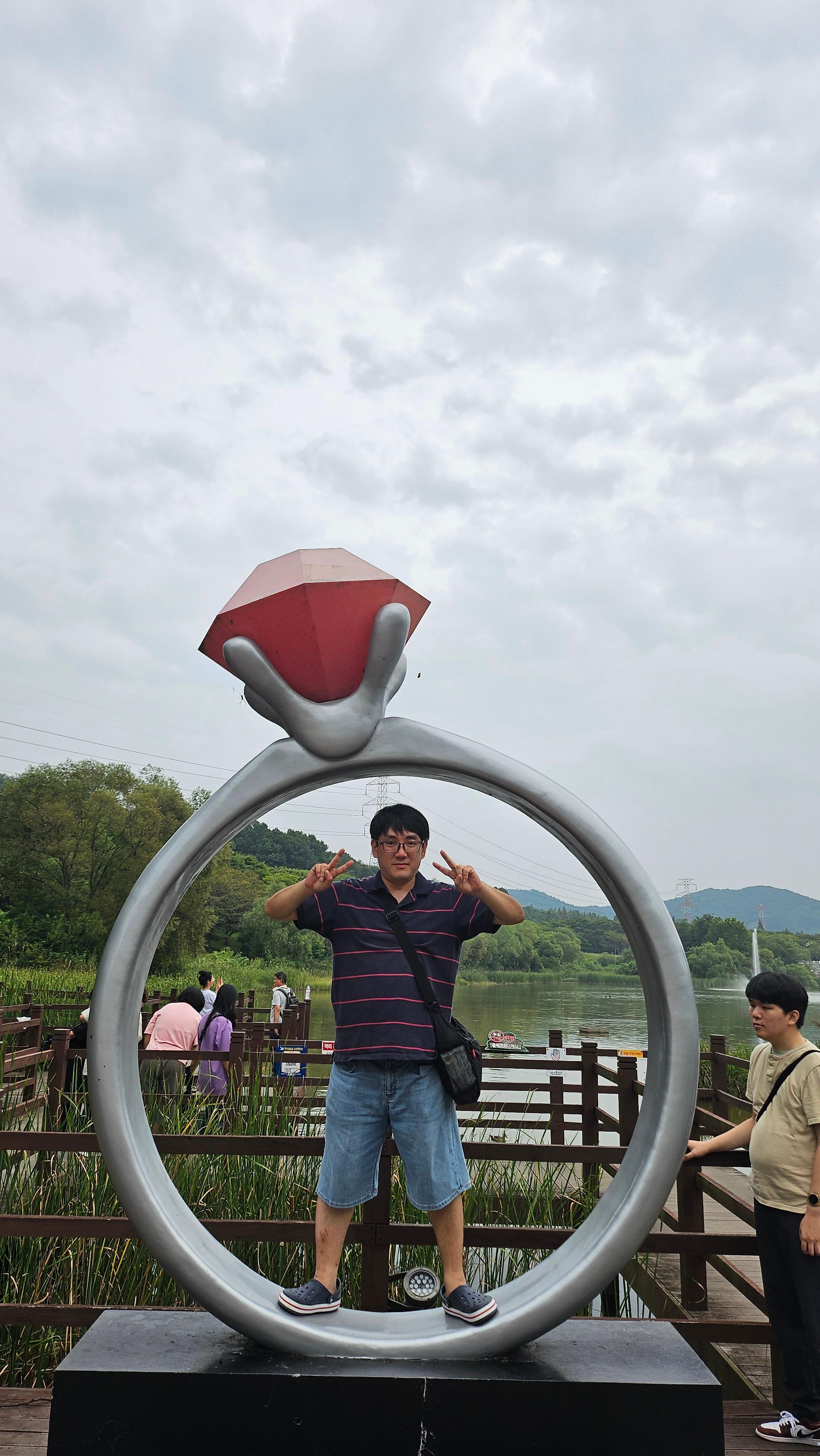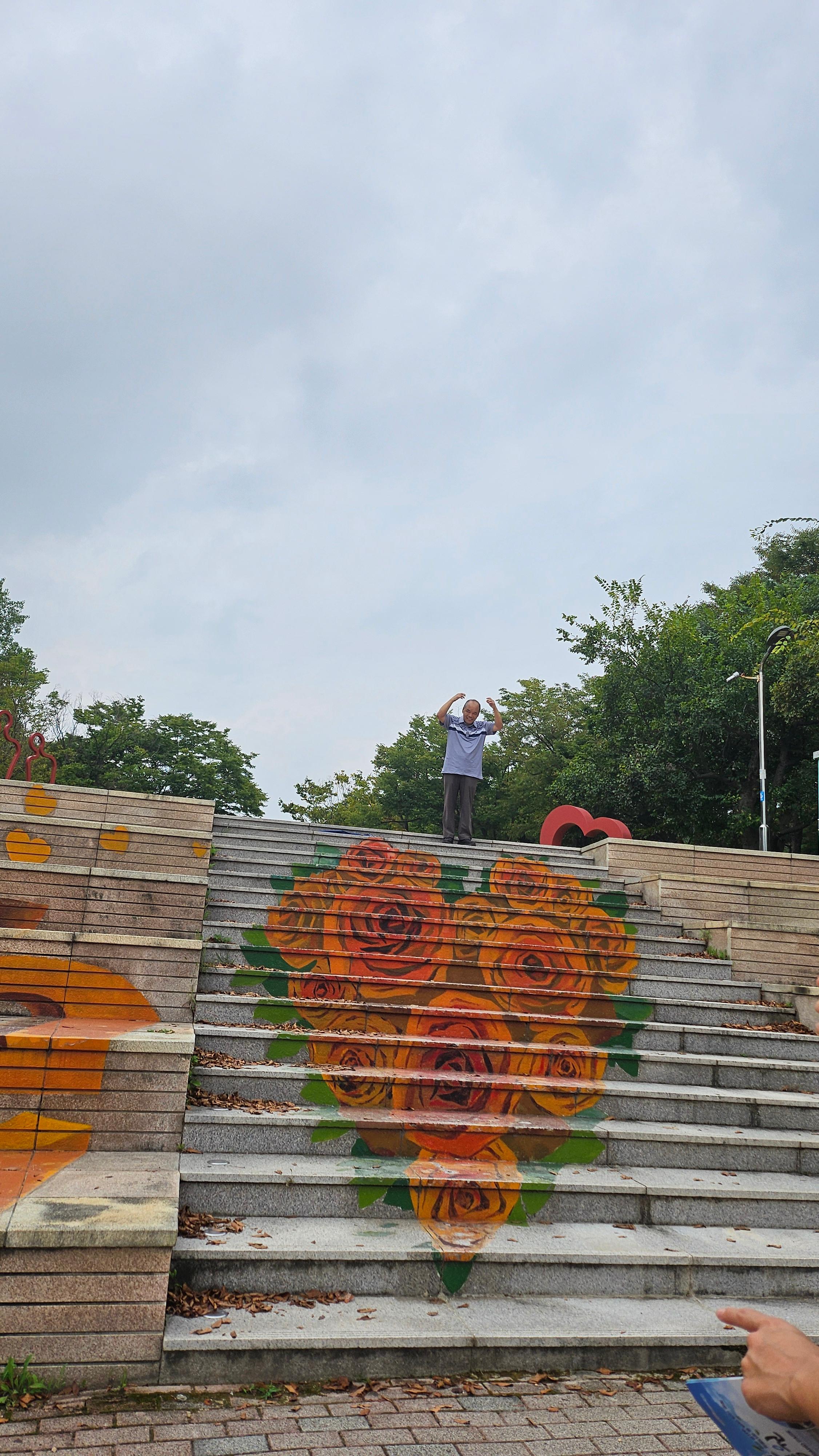 식사 후에는 공원 곳곳의 명소를 둘러보며 개성 넘치는 사진을 남겼습니다. "LOVE" 글자 조형물 앞에서 한껏 근엄(?)하게 서본 모습, 장미꽃이 활짝 핀 계단에서 포즈를 취한 모습, 그리고 초대형 반지 조형물 안에서 포즈를 잡은 장면까지, 모두의 유쾌한 에너지가 사진에 가득 담겼습니다.
