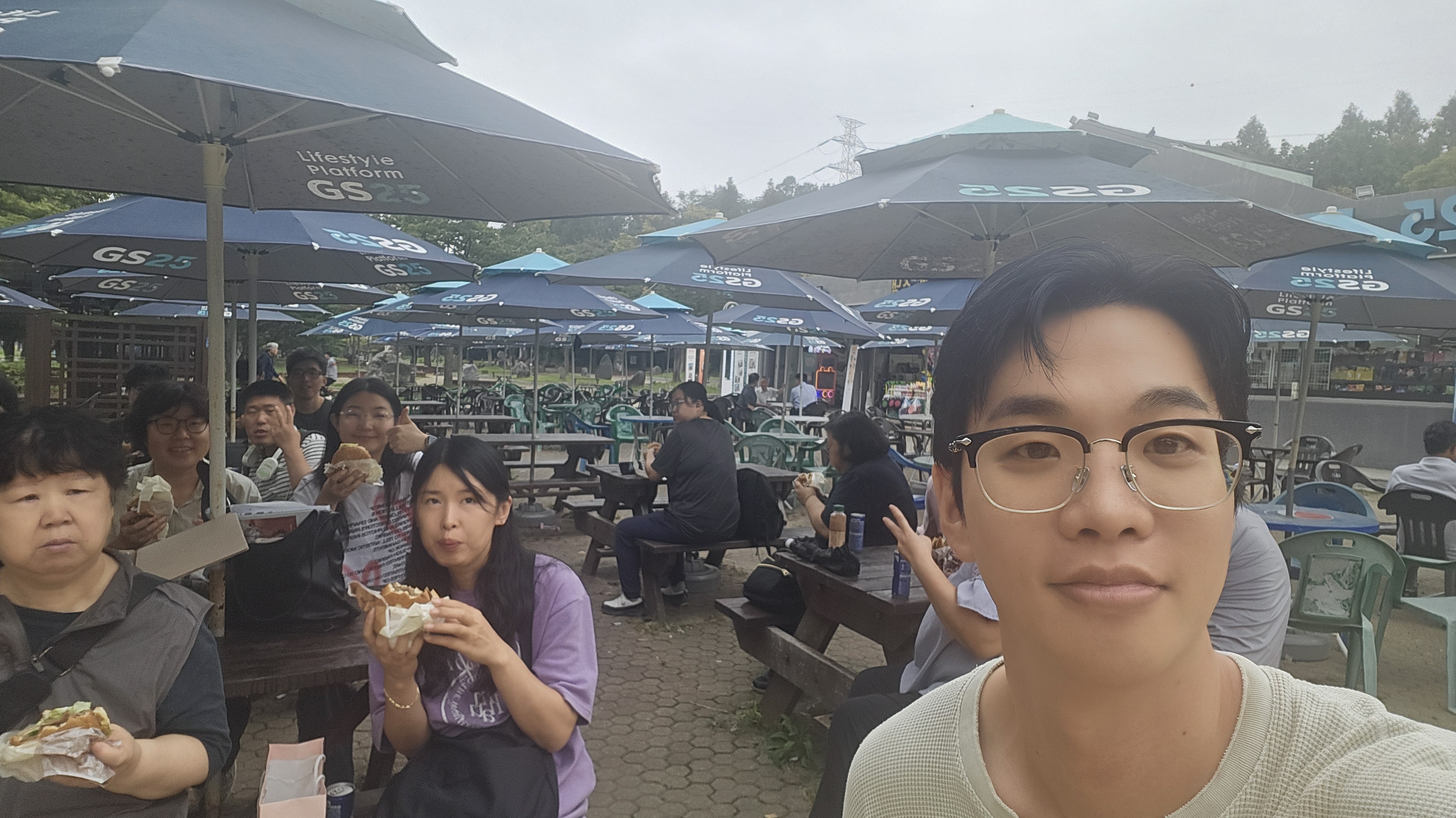 먼저 야외 테이블에서 햄버거를 나눠 먹으며 에너지를 충전했습니다. 날이 많이 흐리긴 했지만, 함께 나눈 점심은 특별한 소풍 도시락처럼 느껴졌습니다.