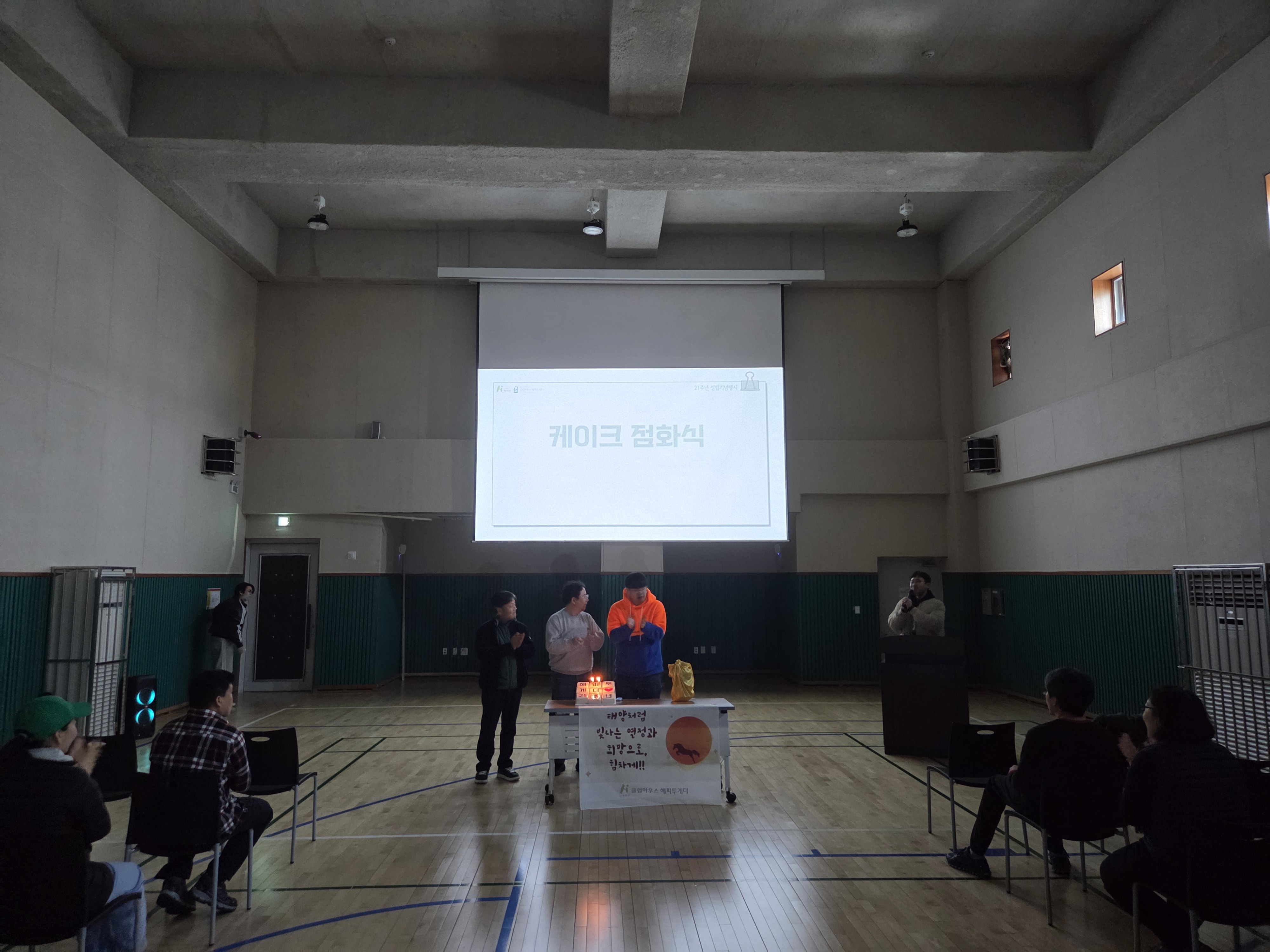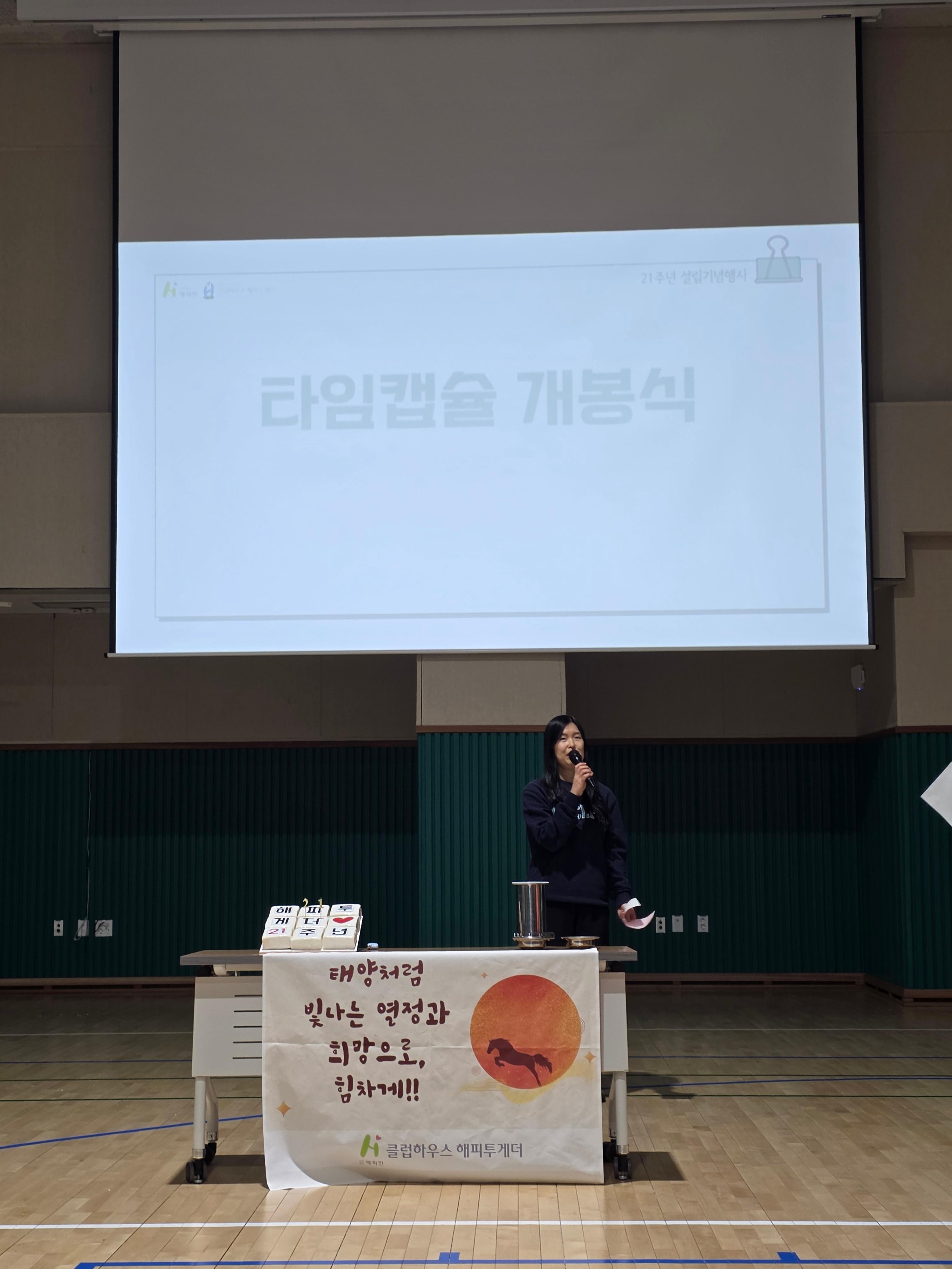 행사의 시작은 시설장님의 인사말로 문을 열었습니다. 시설장님께서는 해피투게더가 걸어온 21년의 시간과 함께해 준 회원, 직원, 그리고 공동체에 대한 감사의 마음을 전하며 앞으로도 함께 성장해 나가자는 따뜻한 메시지를 전하였습니다.