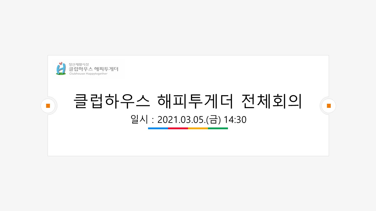 소식/회의자료 및 식단표 2021.03.05. 전체회의 자료 클럽하우스 해피투게더 2021. 3. 5. 13:03 전체회의 자료 올려드립니다. 자료 확인하시고 회의에 참석해주시면 감사하겠습니다. 회의때 뵙겠습니다 ^^ 03-05 전체회의자료.pdf 0.58MB