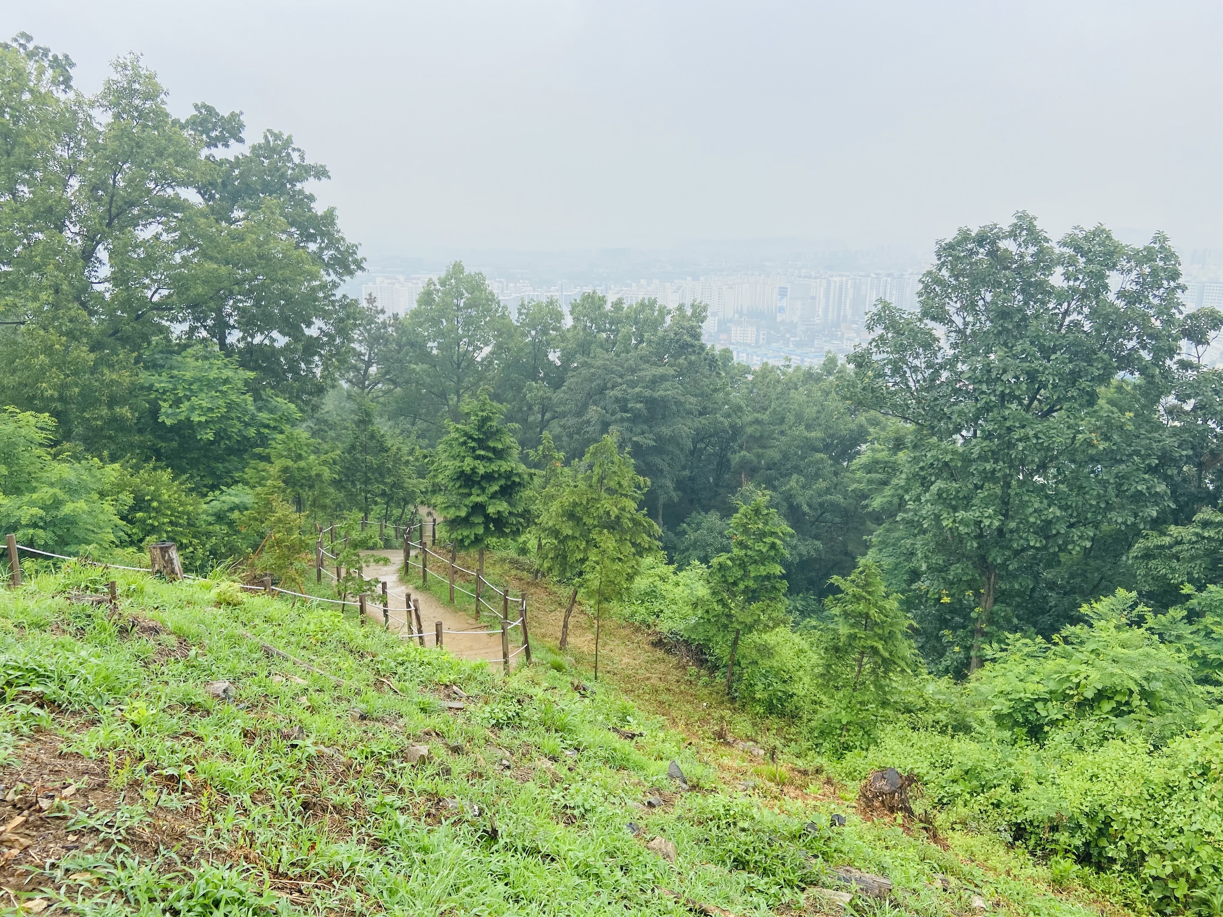 나하고 김0록님, 직원 정0주씨, 사무국장님이 한 조였다. 비는 왔지만, 약한 비여서 걷는데 전혀 지장없었고, 날씨는 우중충했지만 우리는 등산을 하였다. 비가와서 촉촉하고 흐린 그 특유의 분위기도 나쁘지 않았다. 한 15분 걸어서 계양산 중간쯤인 나무정자가 있는곳에 다다르게 되었다. 정자를 중심으로 사방이 트여있는게 인상적이였다. 그 중간지점이 되게 넓었고, 가슴까지 시원하게 뻥 뚫리게 해주는 것 같았다^^ 직원들의 주도로 사진을 많이 찍었고, 매우 좋았었다. 사방이 탁 트인것을 본 것 만으로도 많은 힐링이 될 수 있는 좋은 계기가 될 수 있는 것 같았다. 또한 여러 자연경관이 매우 아름다웠다^^