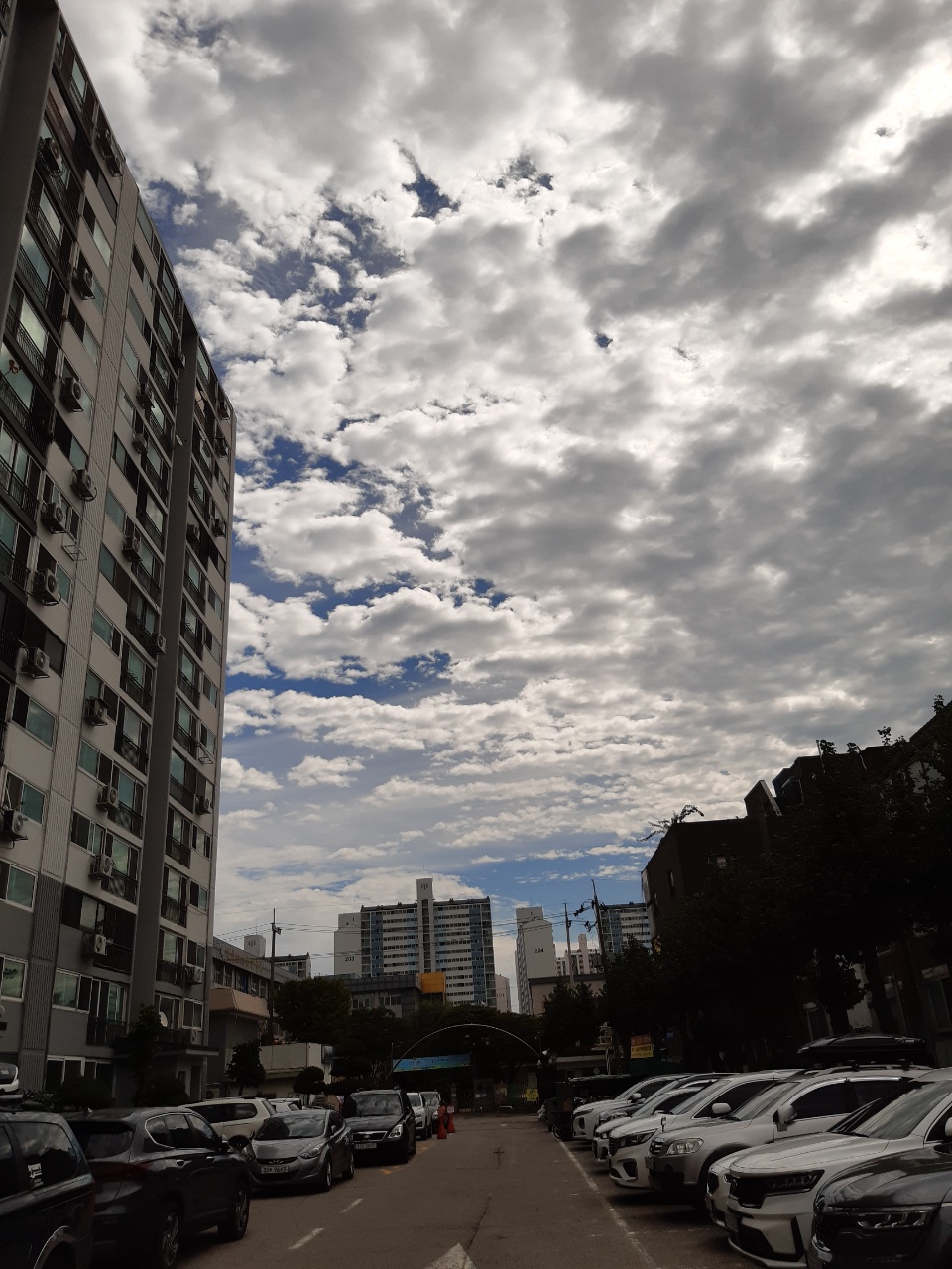 구름으로 둘러쌓인 아파트는 조용,자동차가 마치 시위를 하듯 모여있네요