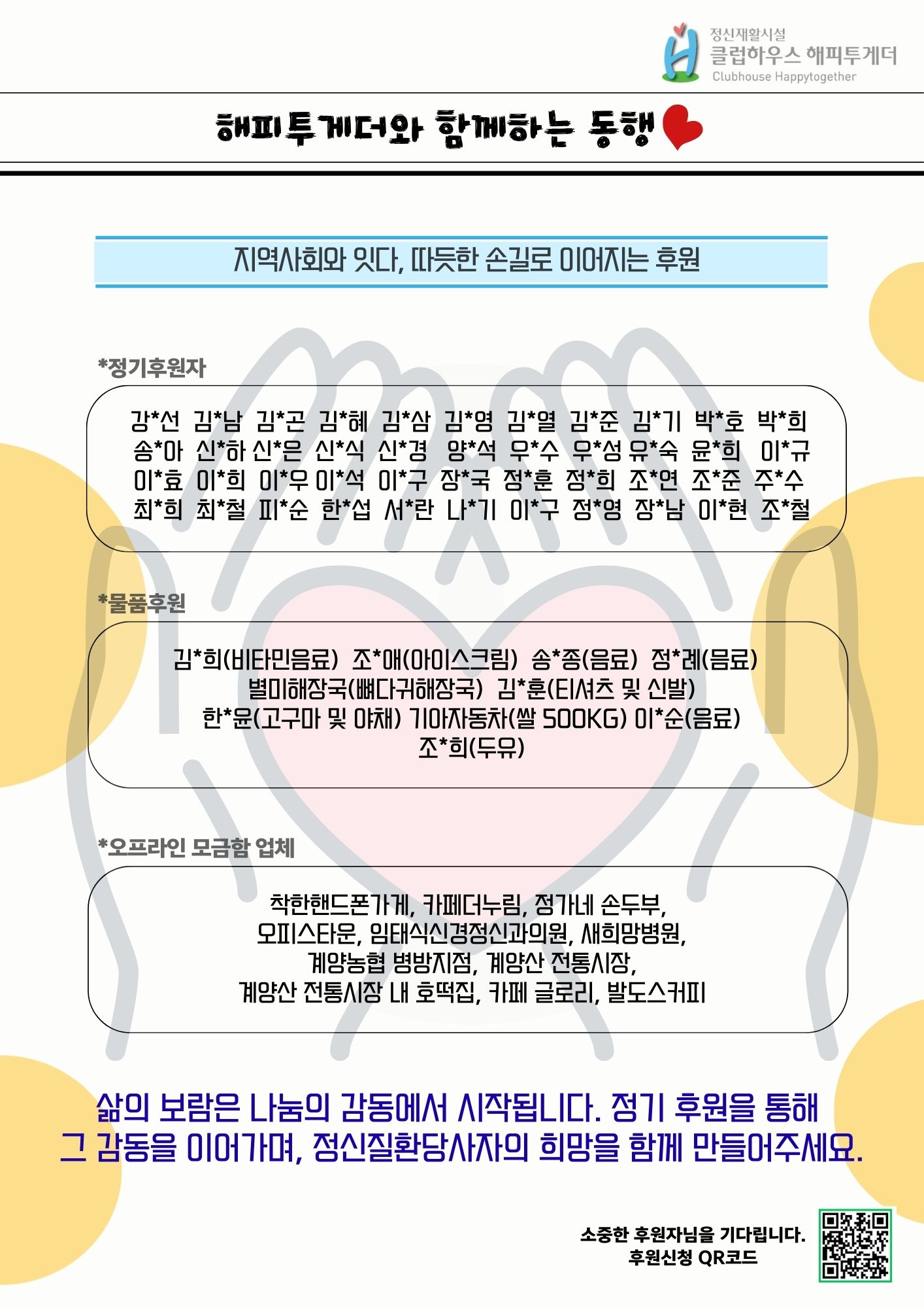 앞으로도 해피투게더는 회원들의 회복과 참여가 이어지는 공간을 만들어가겠습니다.